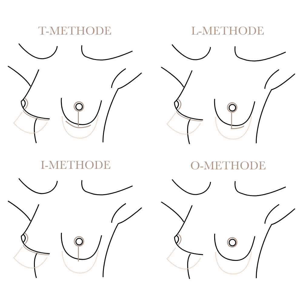 Je mehr vom Hautmantel verkleinert und die Brustwarze gehoben werden muss, um eine optimale Brustform zu erreichen, desto ausgedehnter müssen die Narben gesetzt werden. Ist lediglich die Brustwarze zu tief und der Hautmantel nur sehr gering zu straffen, kann die Narbe um den Warzenhof ausreichen. Man spricht von einer periareolären Straffung (O-Methode). Reicht die O-Methode nicht aus, wird die I-Methode durchgeführt. Bei der L- und T-Methode verlaufen die Narben zusätzlich in der Unterbrustfalte (siehe Bild).